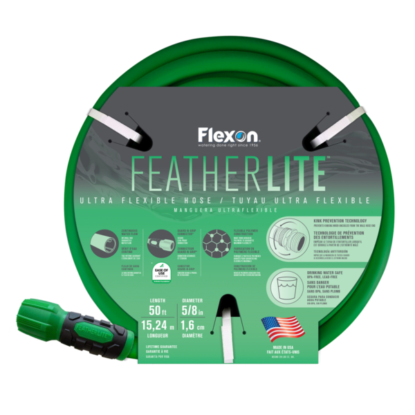 FeatherLite® hoses are manufactured with the most innovative kink prevention and water flow technologies. Designed to stay flexible in both hot and cold temperatures, FeatherLite® hoses provide maximum performance for years to come. The ergonomic grippers on both ends of the hose allow users to easily tighten the faucet or nozzle. Furthermore, the male swivel coupling will prevent the hose from kinking. Simply hold the male end with the gripper attached and watch the hose unravel itself.