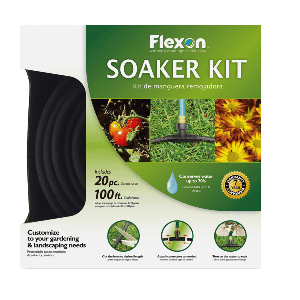 Flexon’s Soaker Kit saves time and money. Proper use of a soaker hose conserves up to 70 percent of water use versus that of traditional hoses or sprinklers. It delivers water at the root level, resulting in larger and lusher fruits, vegetables, greenery and flowers. Our soaker hoses allow water to seep directly into the base of root systems – providing continuous water flow for as long as needed without drowning the soil or wasting water. The Soaker Kit makes effective gardening and landscaping simple, ensuring consistent watering throughout the day or night to your plants, flowers, shrubs, trees or bushes. It adapts to any garden size and can be configured to focus on concentrated areas. The Soaker Kit contains a 100-foot soaker hose and a 20-piece connector, along with detailed instructions for watering and hose setup.