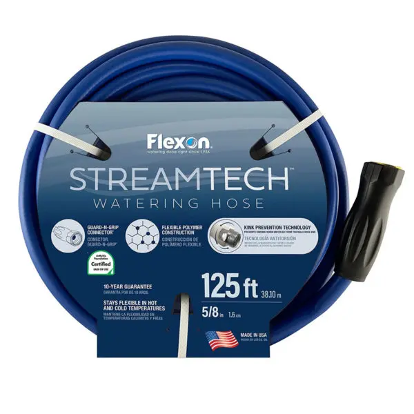 The Streamtech® Watering Hose is constructed with a flexible polymer allowing for the hose to be soft to the touch, lightweight, and flexible. This hose features a male swivel coupling with kink prevention technology which helps the hose uncoil naturally without kinking from the male end of the hose and features our patented Guard-N-Grip connector allowing a leak proof connection to your spigot. Made in the USA with Globally Sourced Components, this hose stays flexible in hot and cold temperatures making this hose perfect for your home watering needs.